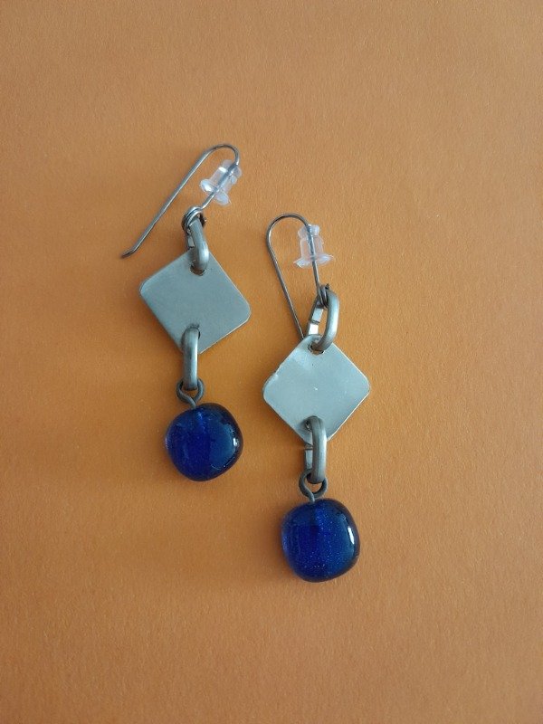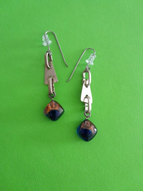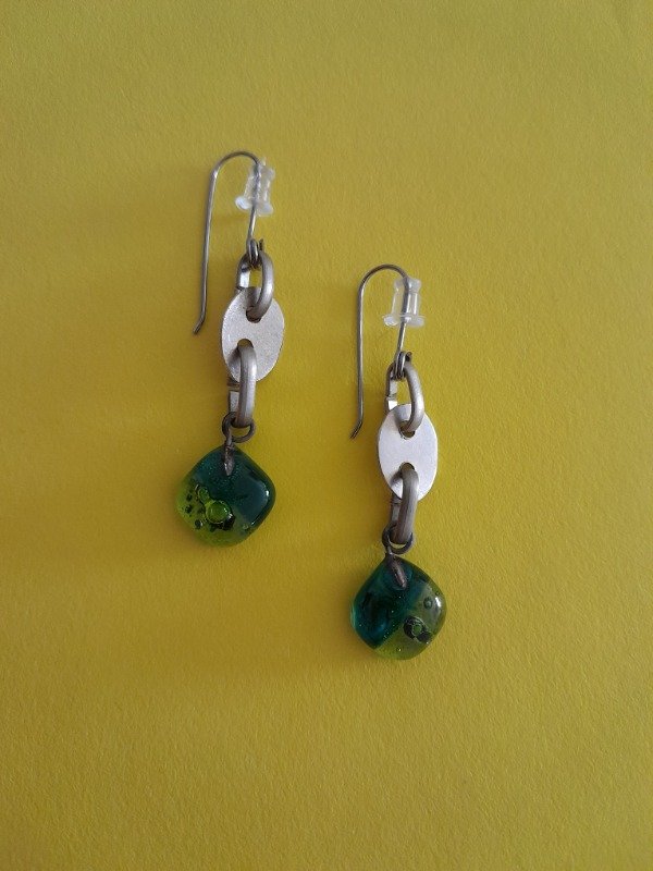Aros con pasante de acero quirúrgico el metal es alpaca y el detalle de color es vidrio trabajado bajo la técnica de vitrofusión.